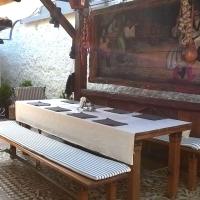 В ресторане с винным погребом и открытой гостиной зоной, оформленной в загородном стиле, с камином подают блюда венгерской кухни.