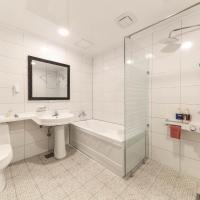 Собственная ванная комната с душем и ванной укомплектована феном.
