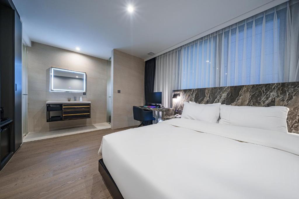 Номера отеля Amare Jongno оформлены в современном "королевском" стиле и обставлены изысканной мебелью и кроватями.