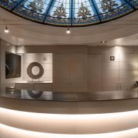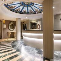 Стойка регистрации отеля Catalonia Roma с большим витражным потолочным окном работает круглосуточно.
