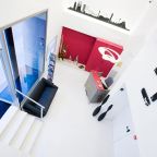Отель Live & Dream оформлен в стиле минимализма с использованием белого цвета, на фоне которого выделяются яркое постельное белье и мебель.