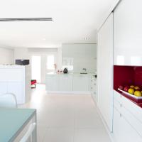 На кухне есть микроволновая печь, холодильник, керамическая плита, духовка, тостер и кофеварка.