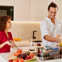 В числе удобств посудомоечная машина, микроволновая печь, холодильник, чайник и кофемашина.