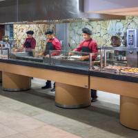 В ресторане с открытой кухней сервируется вкусный «шведский стол» для всей семьи.