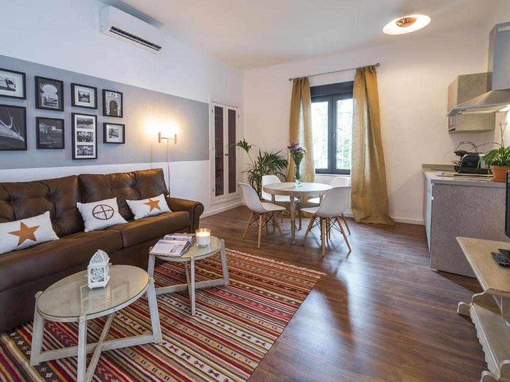 В номерах-студио с двуспальной кроватью и ванной комнатой обустроена гостиная зона с диваном и кухней.