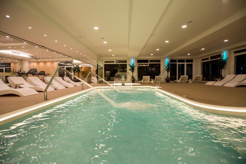 На территории имеется открытый бассейн с меблированной террасой для загара, а также крытый бассейн.