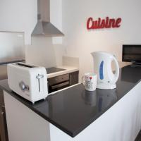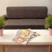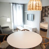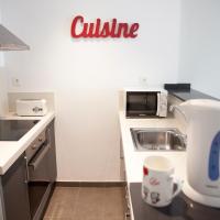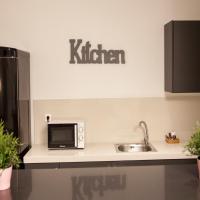 В современных апартаментах обустроена гостиная/обеденная зона с телевизором с плоским экраном, а также оборудованная кухня.