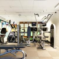 Guests can socialize in the hotel bar after working out in the fitness room.