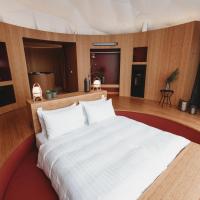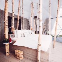 К услугам гостей коттеджи-капсулы, закрепленные на деревянной платформе.