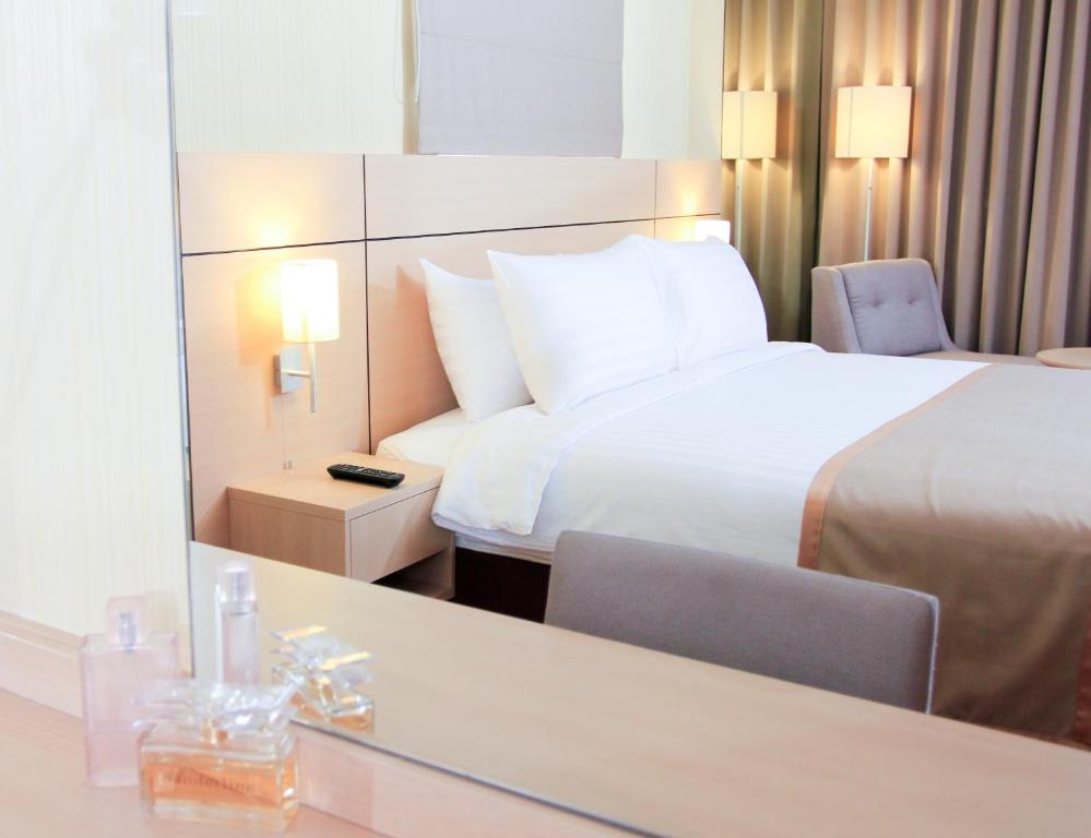 Номера меблированы в современном стиле в нейтральных тонах и оснащены телевизором с плоским экраном, мини-баром и принадлежностями для чая/кофе.