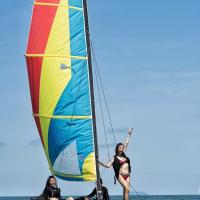На пляже можно поиграть в волейбол или искупаться в море.