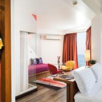 Номерной фонд включает 104 комнаты и апартаменты. Из некоторых можно любоваться морским пейзажем через большие от пола до потолка окна. Оформление яркое, стильное с насыщенными цветовыми акцентами. В числе удобств ТВ, холодильник, кондиционер, санузел с душем.