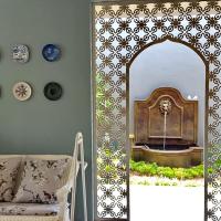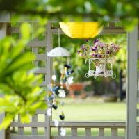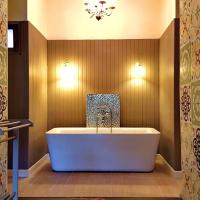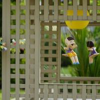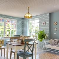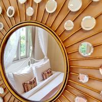 Интерьер просторных люксов, разместившихся в ландшафтном саду, выполнен в современном стиле, а стены украшены цветочным орнаментом.