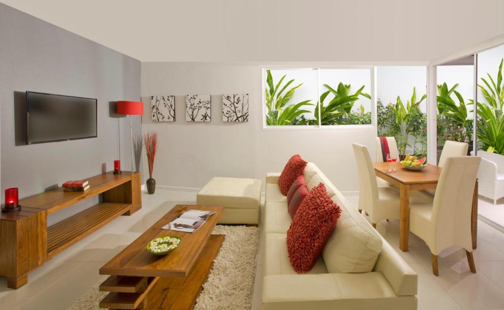Номерной фонд выполнен в стиле классического минимализма с элементами тайского декора. Во всех категориях «Апартаменты» есть прекрасная меблировка, Wi-Fi, системы кондиционирования, зонирование на кухню и гостиную, ванные комнаты с душем и санузлом, наборами для мытья.