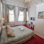 Богатый декор с роскошным постельным бельем и люстрами напоминает дворцовые интерьеры.