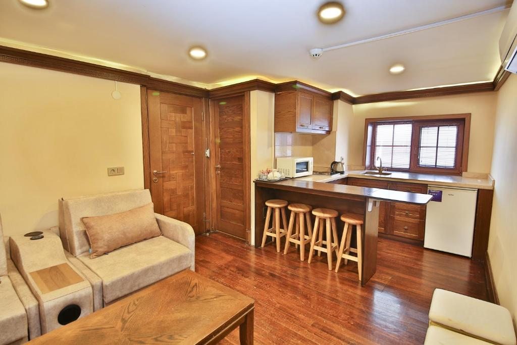 Апартаменты и люксы отеля Kumluk Konak оснащены деревянным рабочим столом.