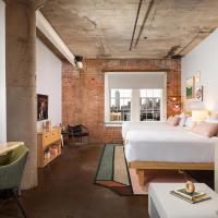 Guest rooms at the Canvas Hotel Dallas (showcase polished concrete floors, custom furnishings, and large picture windows.