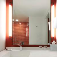 Во всех просторных номерах отеля Park MGM Las Vegas есть сейф, плотные шторы, большой туалетный столик и прикроватные розетки для телефонов и компьютеров.