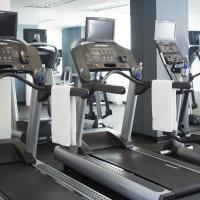 Тренажерный зал отеля с зеркалами от пола до потолка оснащен настенными телевизорами.