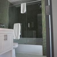 Ванная комната отделана мрамором или европейской стекломозаичной плиткой.