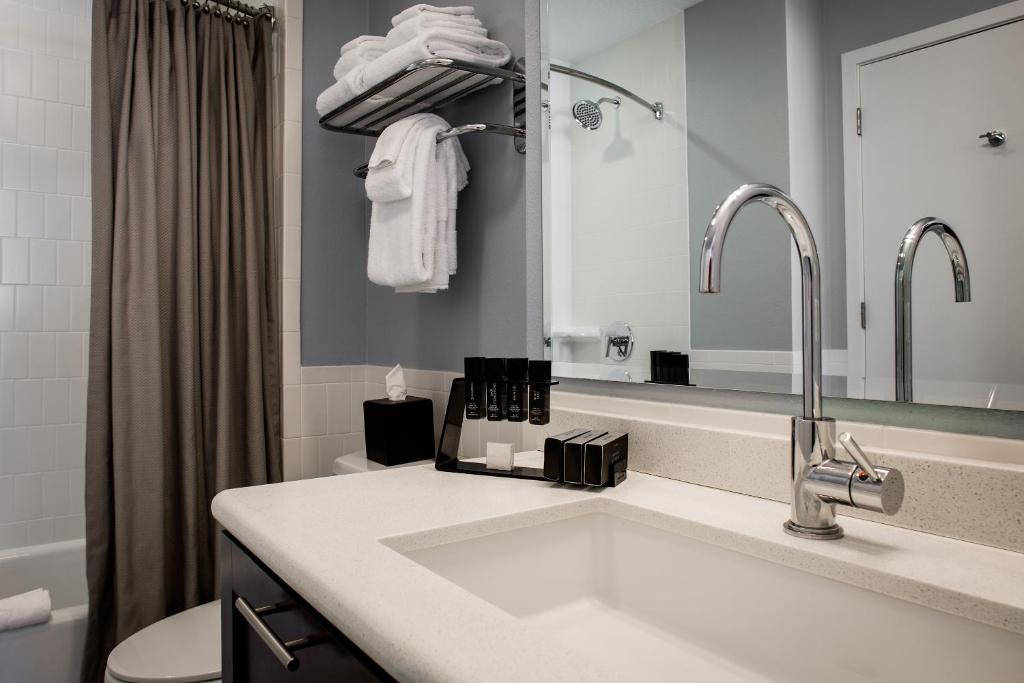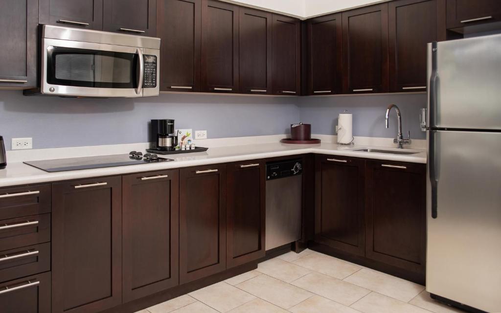 Each suite boasts A full-size kitchen equipped with stainless steel appliances including refrigerator, stovetop, dishwasher and microwave.