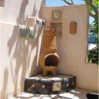 Surrounded by unique architecture, Les Artistes Inn features outdoor seating areas and stone walkways where guests can stroll through gardens featuring fountains and lush greenery.