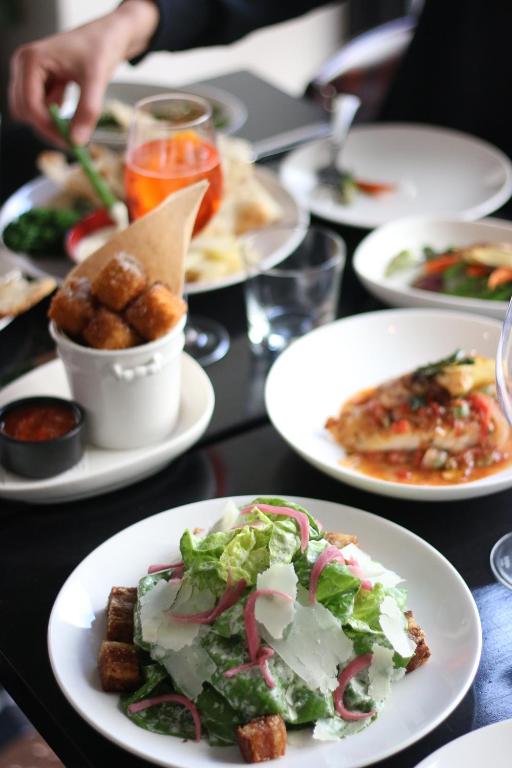 Guests can dine in the hotel's restaurant, Tratto, a modern Italian trattoria with a rustic soul featuring shareable dishes and hand-crafted cocktails.
